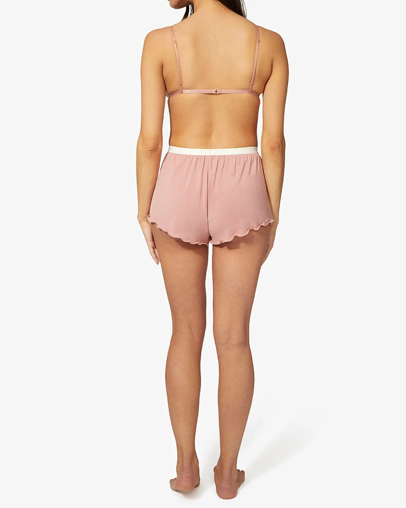 Our mid-rise Booty Short is in an airy and breathable modal jersey with flatlock princess seams and a soft-knit elastic waistband. The faux fly is adorned with pearlized buttons, while the hem is finished with a decorative lettuce edge.