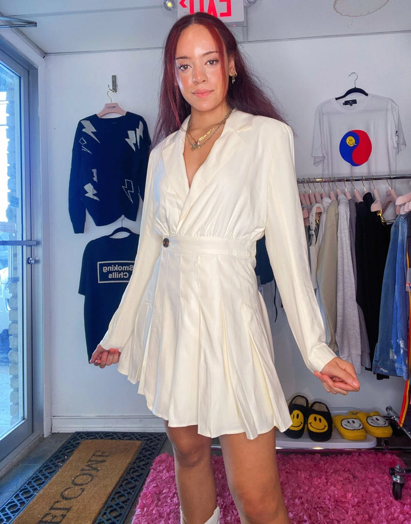 Our Blazer Tennis Dress is made in twill suiting that joinsa crisp, single-breasted jacket, cropped to the waist, with a mini skirt that gives way to a sweep of pleats. The dipped v-neckline is framed by padded shoulders to create an especially flattering silhouette.