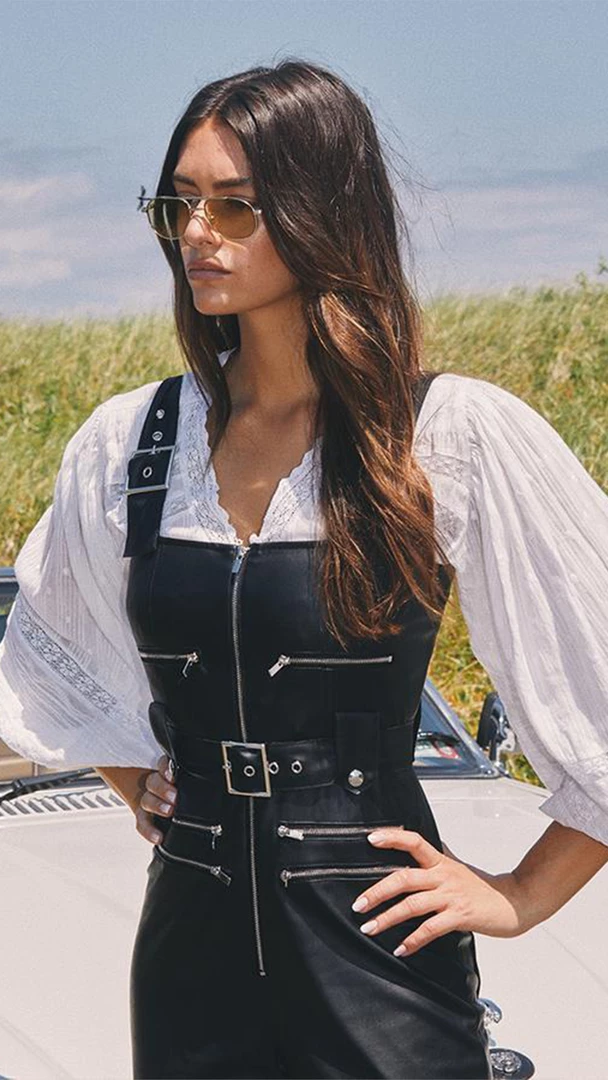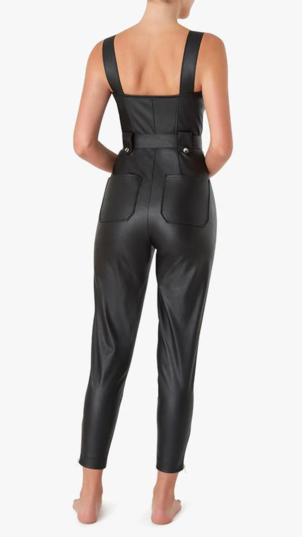 The vegan stretch leather Moto overall is an edgy, form fitting silhouette, with an optional buckled waist belt, adjustable straps and polished zippers including a center-front closure.